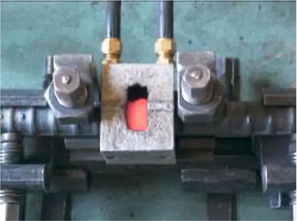 手動ガス圧接は、接合端面を突き合せて、圧力を加えながら、接合部を酸素・アセチレン炎で1200℃~1300℃ に加熱し、接合端面を溶かすことなく赤熱状態でふくらみを作り接合する工法です